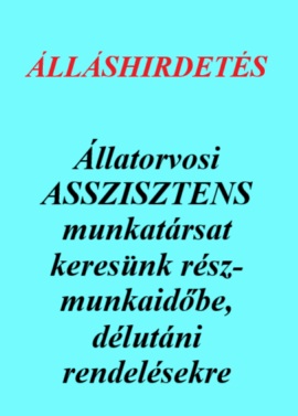 Nyíregyházi kisállat-praxisunkba keresünk állatorvosi ASSZISZTENS munkatársat rész-munkaidőben Munkavégzés helye: ...
